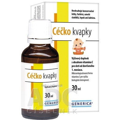Výživový doplnok s obsahom vitamínu C pre deti od dovŕšeného 1. mesiaca. Céčko kvapky obsahujú vitamín C vyrobený technológiou mikroenkapsulácie.