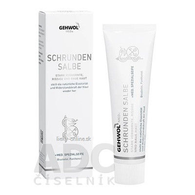 Masť na veľmi zrohovatenú, popraskanú a drsnú pokožku chodidiel. GEHWOL SCHRUNDEN-SALBE je vyrobená na báze zmesi špeciálneho medicinálneho mydla, lanolínu a panthenolu, ktoré mimoriadne priaznivo pôsobia na pokožku. Zároveň obsahuje účinnú kombináciu prírodných éterických olejov, s protizápalovou látkou, bisabolom. Pravidelným používaním pokožka opäť získa svoju prirodzenú pružnosť, odolnosť a bude lepšie chránená pred vonkajšími vplyvmi. Masť bráni vzniku prasklín a zápalom pokožky. Dermatologicky testovaný. Vhodná aj pre diabetikov.